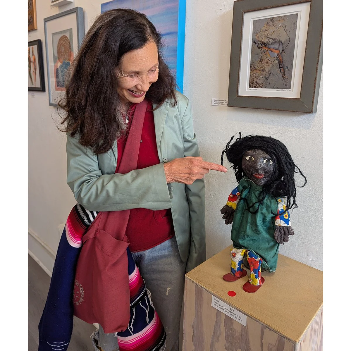 Ems with her Assemblage, Two of My Favorite Things: Local Parks & Books with Deborah Corsini and her weaving, Scream above.