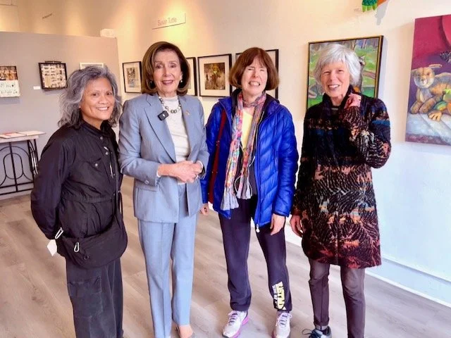 Yesterday afternoon, Representative Nancy Pelosi toured FOG and the other merchants on our Taraval block. While here, she gave all her attention to the art. Many thanks to Lauren Crabbe, co-owner of Andytown Coffee Roasters, for arranging this delightful visit.