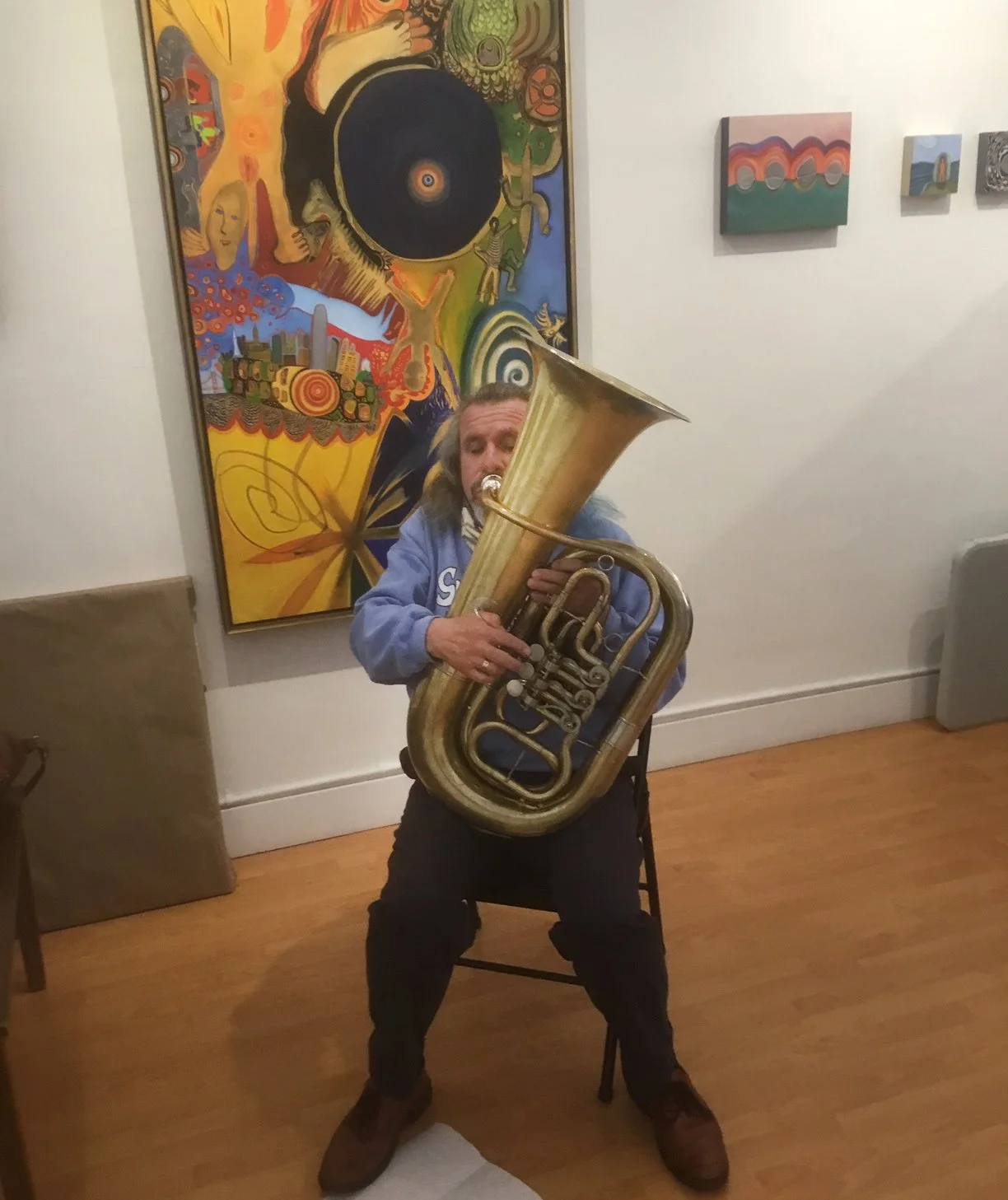 At the reception: Artist Jamie Smith with her husband and their son Henry. Henry dressed for the occasion with his choice of shoes.